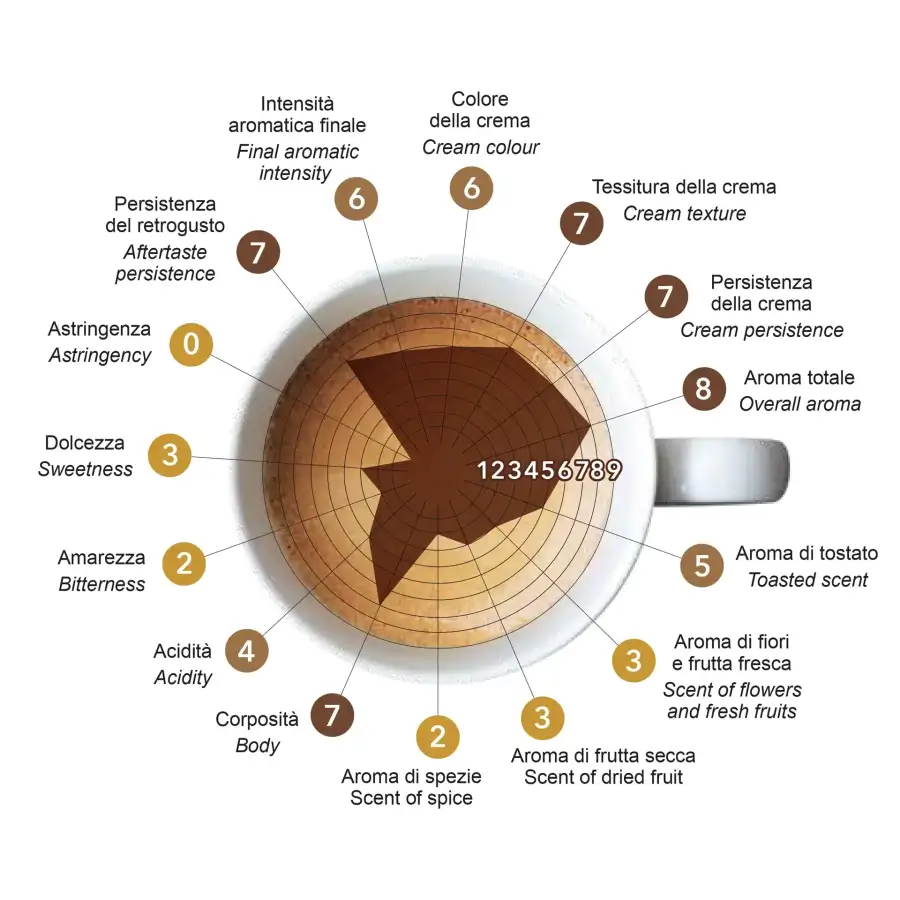 Astringenza: 0 su 9; Persistenza del retrogusto: 7 su 9; Intensità aromatica finale: 6 su 9; Colore della crema: 6 su 9; Tessitura della crema: 7 su 9; Persistenza della crema: 7 su 9; Aroma totale: 8 su 9; Aroma di tostato: 5 su 9; Aroma di fiori e frutta fresca: 3 su 9; Aroma di frutta secca: 3 su 9; Aroma di spezie: 2 su 9; Corposità: 7 su 9; Acidità: 4 su 9; Amarezza: 2 su 9; Dolcezza: 3 su 9.