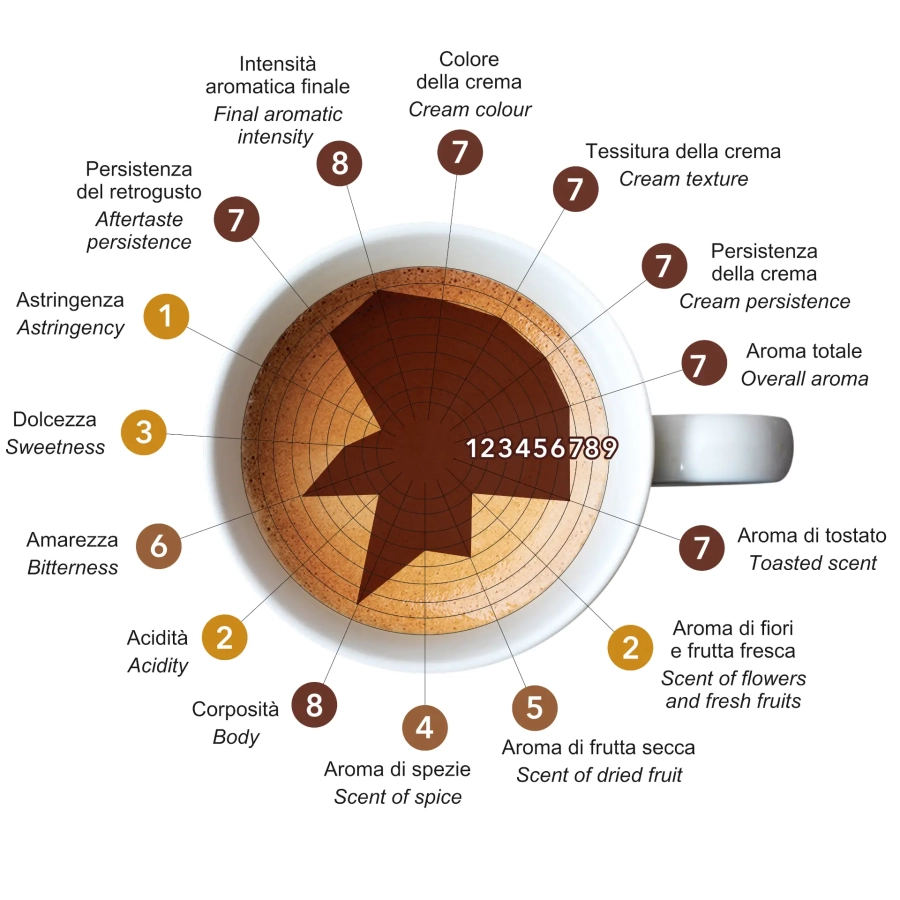 Astringenza: 1 su 9; Persistenza del retrogusto: 7 su 9; Intensità aromatica finale: 8 su 9; Colore della crema: 7 su 9; Tessitura della crema: 7 su 9; Persistenza della crema: 7 su 9; Aroma totale: 7 su 9; Aroma di tostato: 7 su 9; Aroma di fiori e frutta fresca: 2 su 9; Aroma di frutta secca: 5 su 9; Aroma di spezie: 8 su 9; Corposità: 4 su 9; Acidità: 2 su 9; Amarezza: 6 su 9; Dolcezza: 3 su 9.