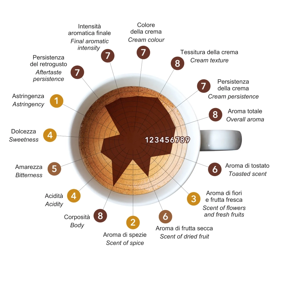 Astringenza: 1 su 9; Persistenza del retrogusto: 7 su 9; Intensità aromatica finale: 7 su 9; Colore della crema: 7 su 9; Tessitura della crema: 8 su 9; Persistenza della crema: 7 su 9; Aroma totale: 8 su 9; Aroma di tostato: 6 su 9; Aroma di fiori e frutta fresca: 3 su 9; Aroma di frutta secca: 6 su 9; Aroma di spezie: 2 su 9; Corposità: 8 su 9; Acidità: 4 su 9; Amarezza: 5 su 9; Dolcezza: 4 su 9.