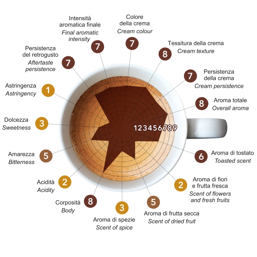 Astringenza: 1 su 9; Persistenza del retrogusto: 7 su 9; Intensità aromatica finale: 7 su 9; Colore della crema: 7 su 9; Tessitura della crema: 8 su 9; Persistenza della crema: 7 su 9; Aroma totale: 8 su 9; Aroma di tostato: 6 su 9; Aroma di fiori e frutta fresca: 2 su 9; Aroma di frutta secca: 5 su 9; Aroma di spezie: 3 su 9; Corposità: 8 su 9; Acidità: 2 su 9; Amarezza: 5 su 9; Dolcezza: 3 su 9.